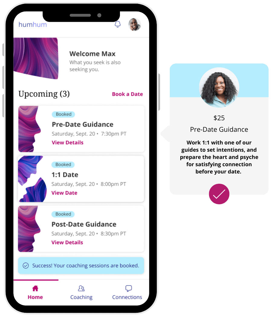 Each date begins guided by a humhum facilitator, trained to uphold a container designed to foster personal growth and authentic connection.